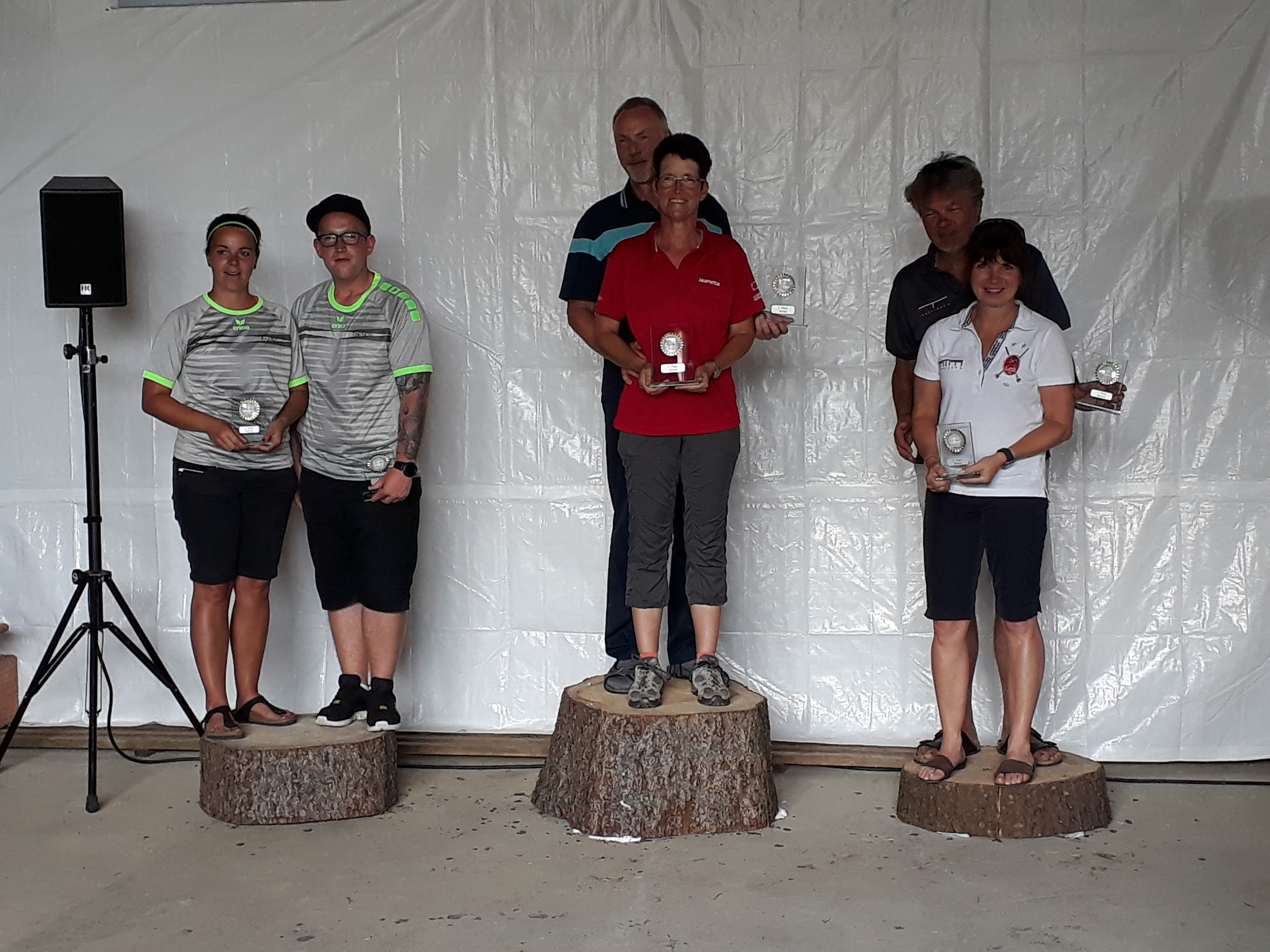 In der Kategorie Mixed mussten sich Stefan und Jani Buchbauer gegen die Kontrahenten erwehren, die ihren ersten Platz nach dem ersten Spieltag angriffen. Aber der Knecht Stefan spielte gemäß der Erwartungen der Herrin Jani und so konnte er die Schatten der vergangenen zwei Tage vergessen. Es reichte mit einer grandiosen Leistung (108 Schläge) für den 1. Platz. Deutscher Meister, yippie! Oli Gießbeck mit Katja Greibel mussten sich leider mit 52 Schlägen (117 gesamt) Torben Hase und Annika Bankmann (112 Schläge), sowie Till und Nicole Thomas (116 Schläge) geschlagen geben. Aber immerhin ein sehr guter, wenn auch undankbarer 4. Platz. Dino und Helga Fernandez erreichten am Ende Platz 11.
